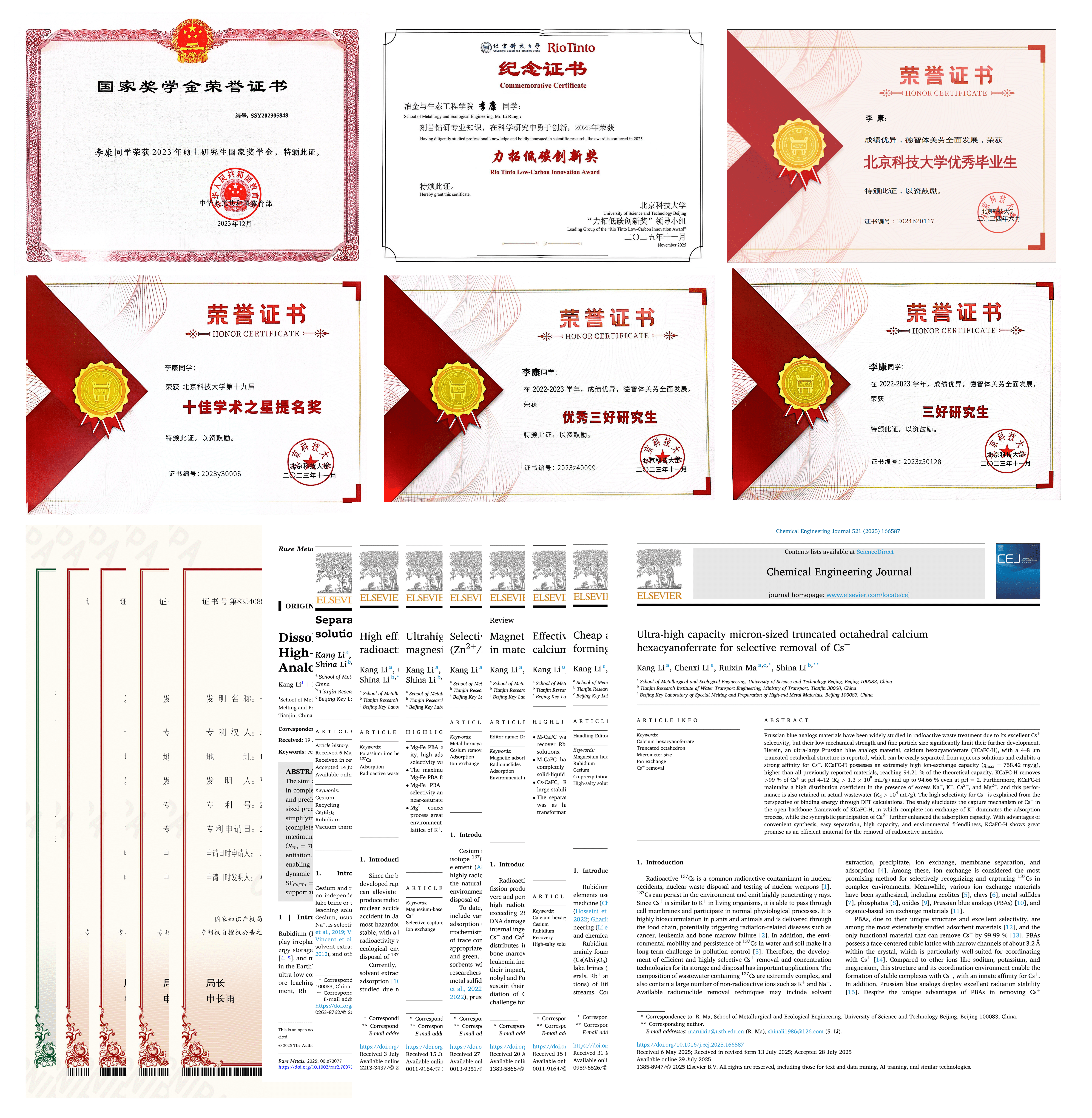 李康,男,1999年8月出生,吃瓜网站 冶金工程专业2024级博士研究生,获2025年中国科协青年科技人才培育工程博士生专项计划,博士研究生国家奖学金、硕士研究生国家奖学金、第十九届“十佳学术之星提名奖”,2024年吃瓜网站 优秀毕业生、优秀三好研究生、三好研究生、佰工钢铁学生创新创业团队奖等奖项荣誉。师从马瑞新教授,从事复杂环境中战略金属的回收和电池材料与器件的合成。截至目前,以第一作者身份发表SCI论文9篇,中科院一区TOP期刊6篇,二区TOP期刊2篇,累计影响因子83。以学生一作授权发明专利5项,申请发明专利4项。