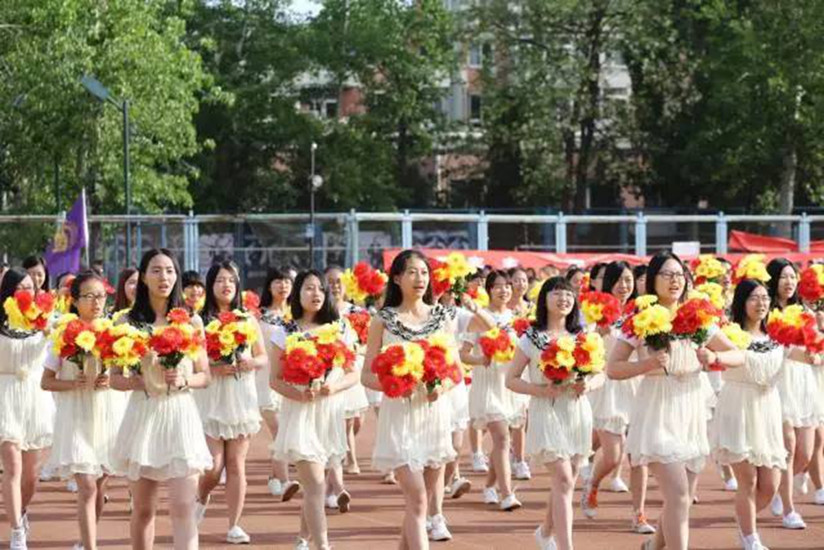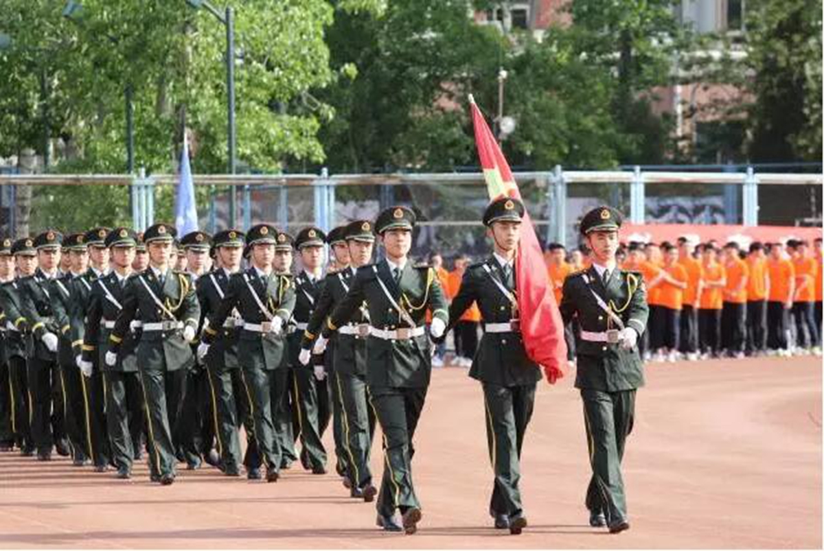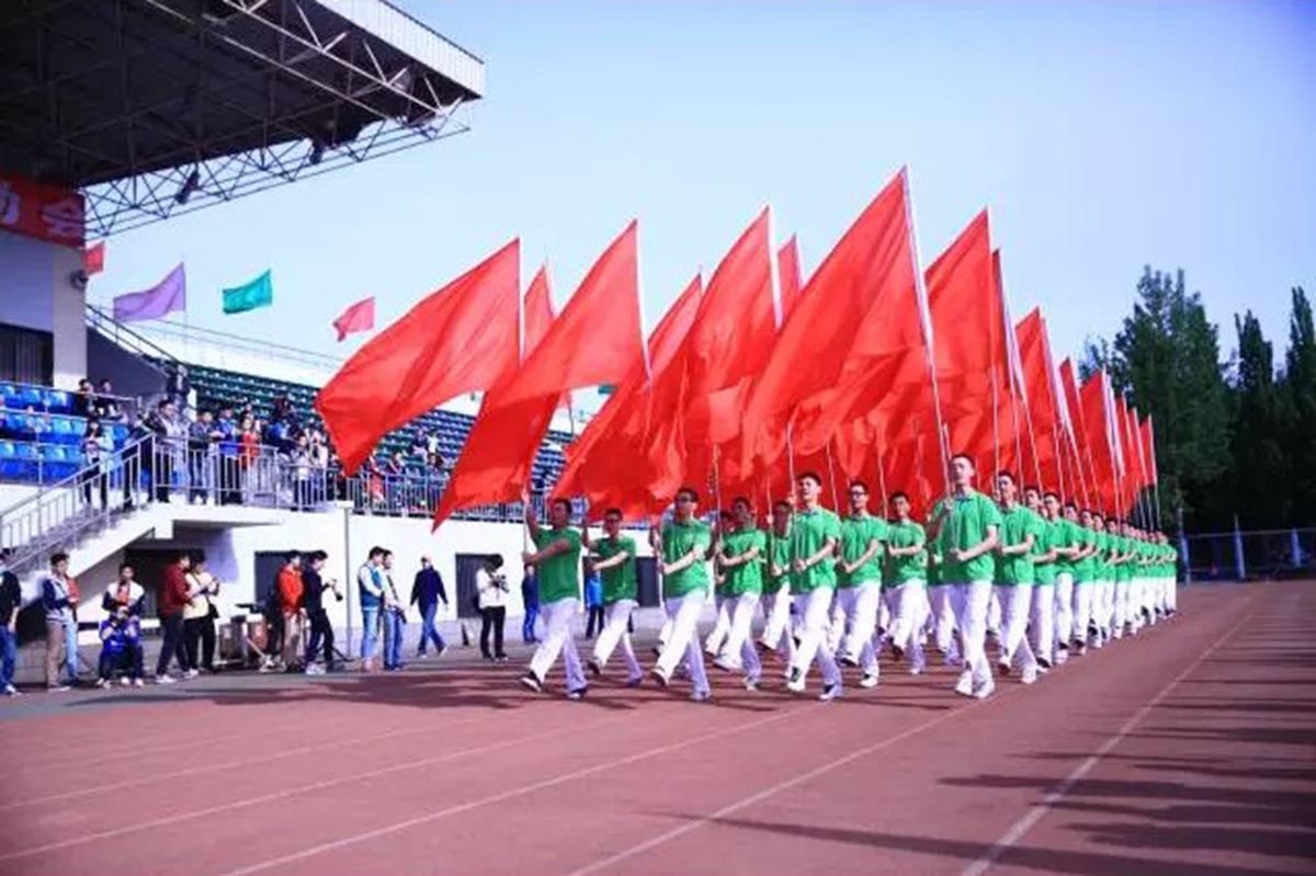 旗海方阵和鲜花方阵在国旗手的的指引下迈着整齐的步伐通过田径场看台,钢小伙铁姑娘们高举鲜艳的红旗和耀眼的鲜花,展现了大学生朝气蓬勃的精神风貌。