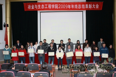 2009年表彰名单。全国挑战杯科技作品竞赛二等奖《中国古代大型铁质文物保护现状及其文化价值调研报告》的第一作者冶研08级王丽莉同学、北京市红色“1+1”活动三等奖、宝钢特等奖学金、优秀辅导员、院长成就奖、先进班集体标兵、校优秀学风班、校先进班级体、校标兵宿舍、研究生“十佳学术之星”、社会实践活动金奖团队、钢铁模拟冶炼大赛金奖、学院先进班集体、热心支持学院工作班级等荣誉获得者依次上台领奖。