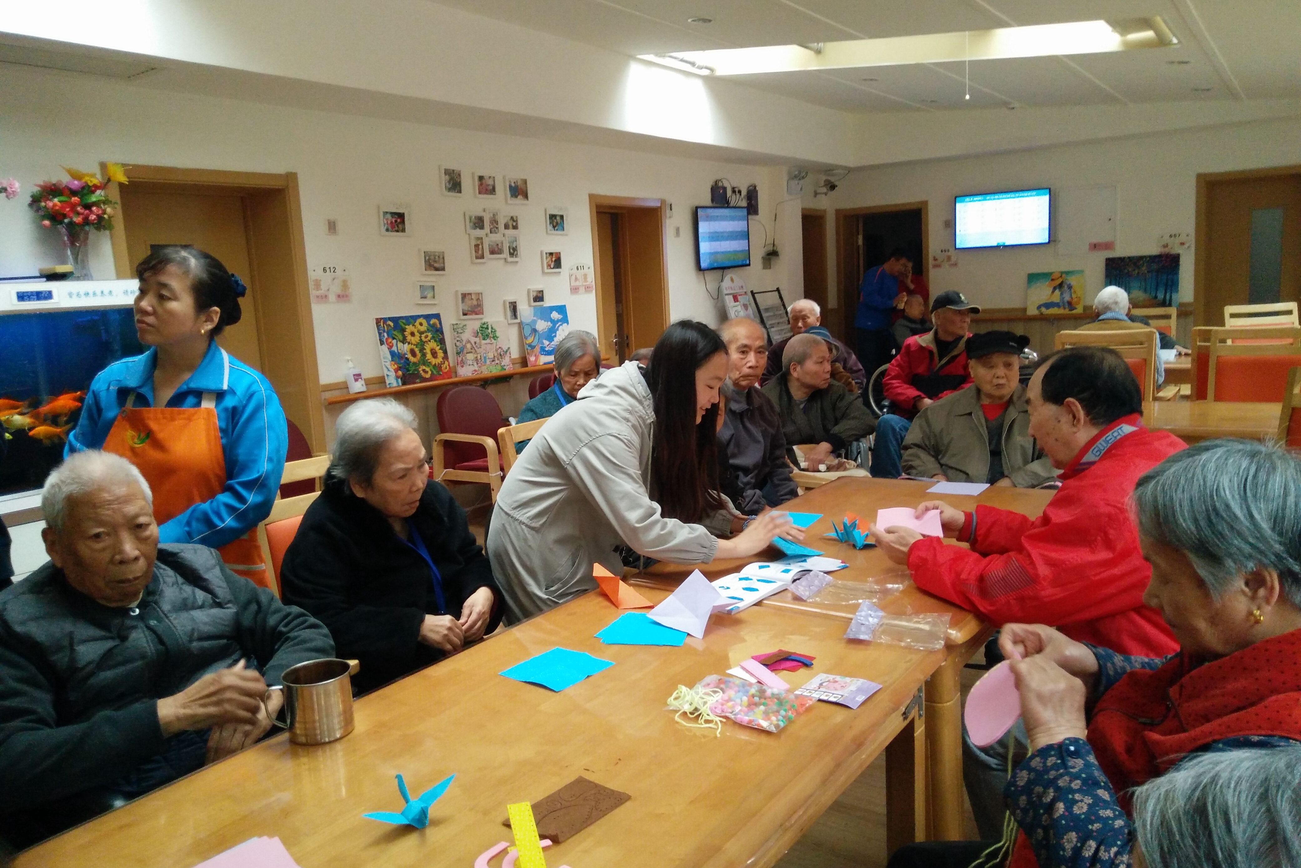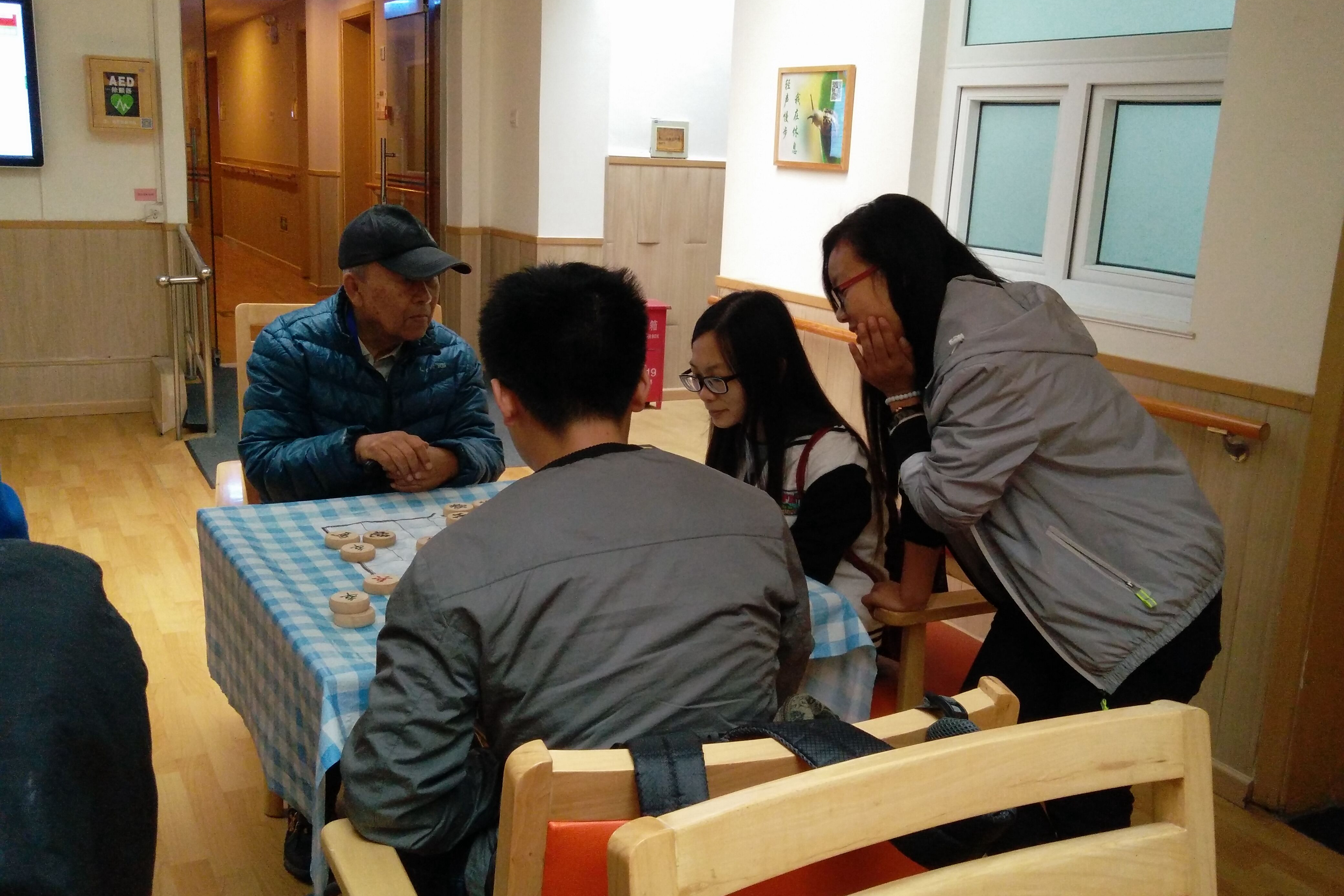 敬老院工作人员带领着部分志愿者们进入到老人们的活动室打扫卫生,其他人则陪老人们聊天,唱歌,折纸等。老人们虽已年迈但却多才多艺,有位爷爷棋艺更是高超,志愿者们纷纷与爷爷切磋棋艺,其乐融融。