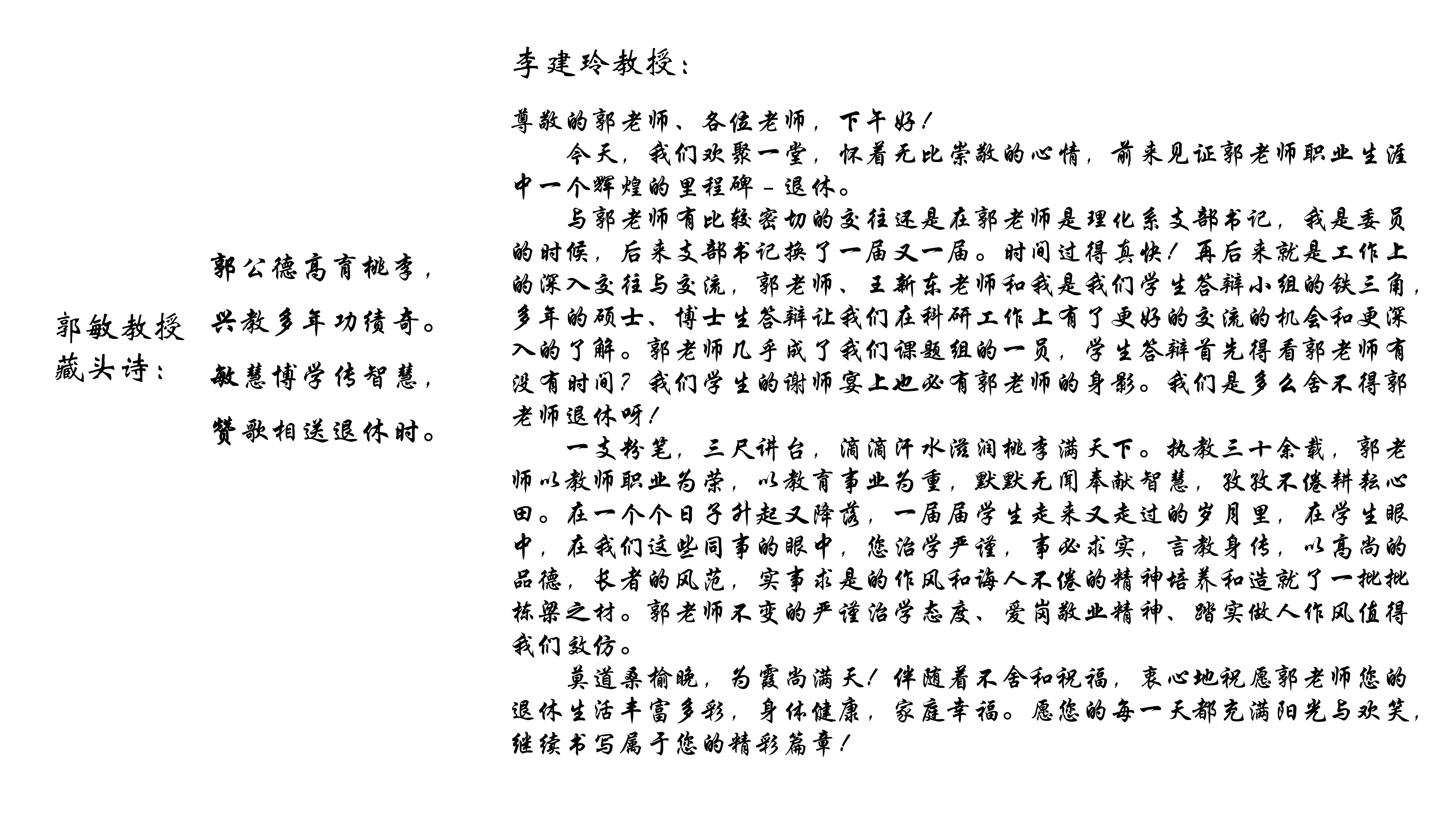 随后,胡晓军、王新东、王丽君、郭敏、李建玲、王福明、庄卫东、于然波等老师畅谈与郭老师共事的温馨和暖心经历以及深深的敬意。胡晓军处长表示郭兴敏老师严谨治学,甘为人梯,以平和的心境、谦逊的态度、创新的精神传承科大老物化人的优秀风范。郭敏教授用一首藏头诗表达了对郭老师职业生涯的赞许;李建玲教授回顾了与郭老师共事的历程,表达对郭老师的敬意与不舍,饱含了春日暖阳般的同事情谊。
