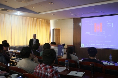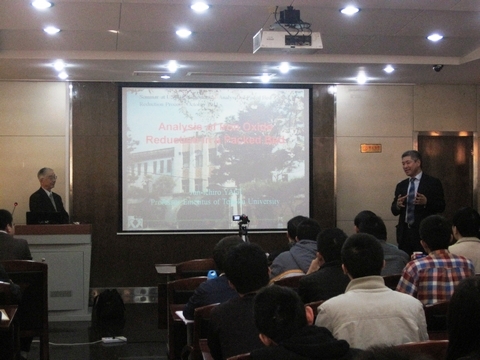 Jun-ichiro Yagi教授以“High Temperature Engineering of Ironmaking Processes”为主题,分别从“Packed Bed”、“Moving Bed”、“Heat Transfer”、“Exergy Analysis”、“Blast Furnace Modeling”、“Reduction of CO2 Emission”、“Cokemaking”等七方面生动而又详实的介绍了炼铁过程中的高温工程。Jun-ichiro Yagi教授精彩的讲解,让同学们对于炼铁过程,特别是炼铁过程中的数值模拟有了一种全新的认识,为以后的冶金研究提供了相应的参考,同时,Jun-ichiro Yagi教授严谨的治学态度也让同学们受益匪浅。