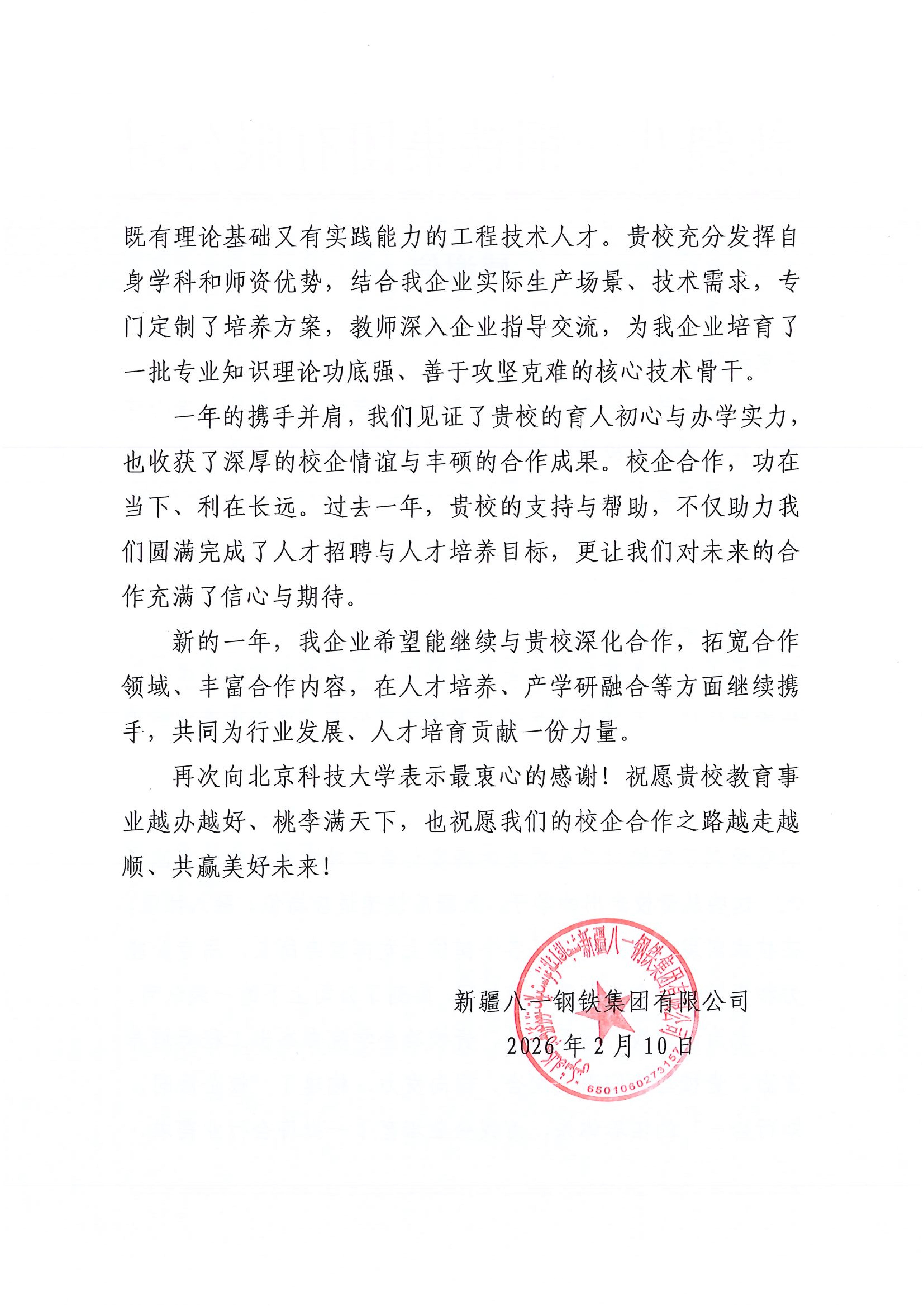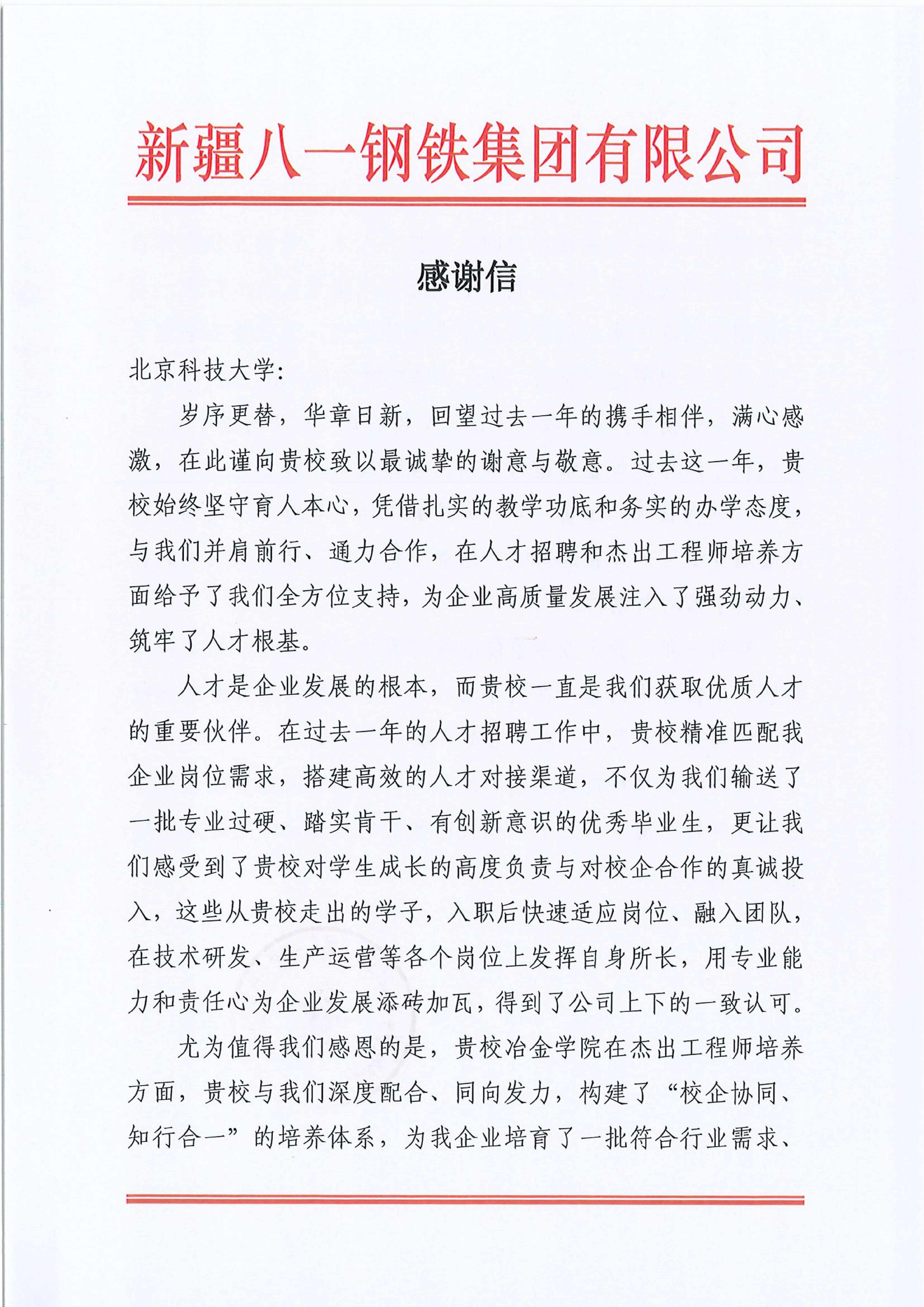 2月10日,新疆八一钢铁集团有限公司向吃瓜网站 发来感谢信,特别对吃瓜网站 在杰出工程师培养方面的卓越贡献给予高度肯定。信中感谢学院坚守育人初心,通过构建“校企协同、知行合一”的培养体系,为企业量身定制培养方案,输送了一批理论基础扎实、实践能力突出、善于攻坚克难的核心技术骨干。这些毕业生在技术研发与生产运营岗位上快速成长,成为推动企业高质量发展的中坚力量。八一钢铁集团表示,愿与学院进一步深化校企合作,拓宽合作领域,在人才培养与产学研融合方面携手共进,共创美好未来。