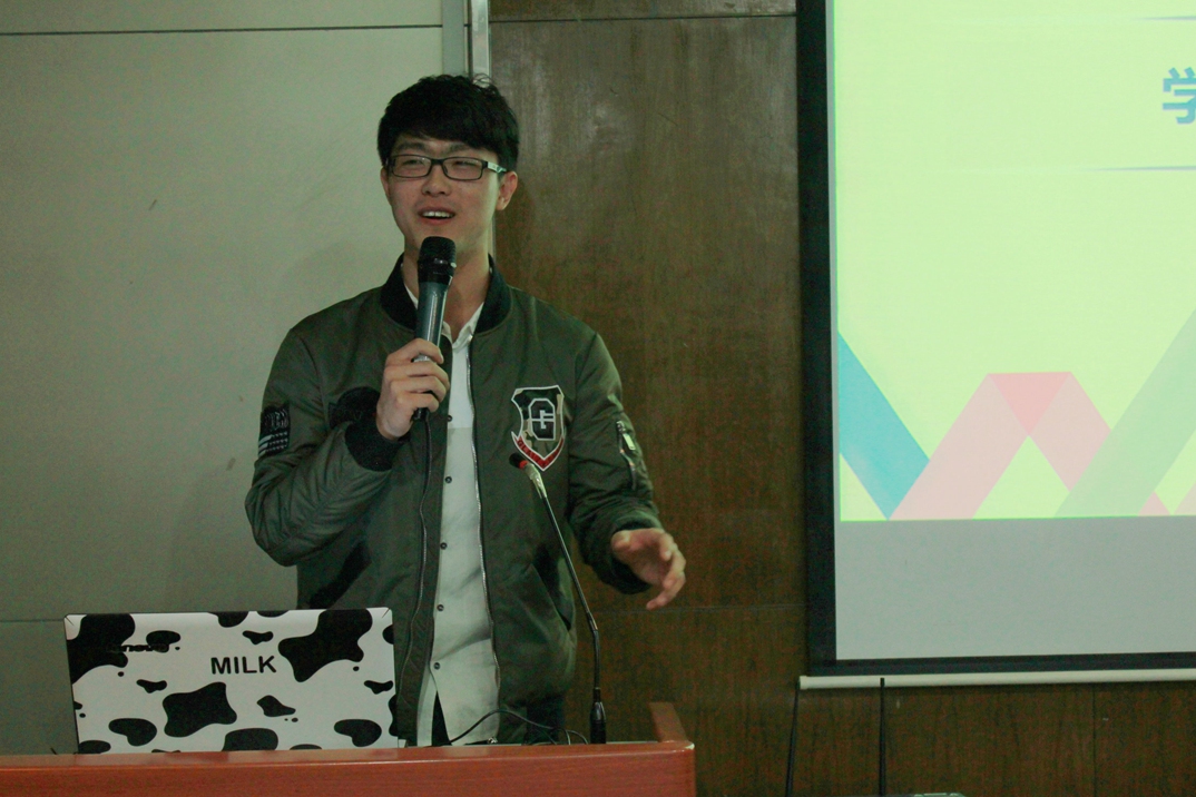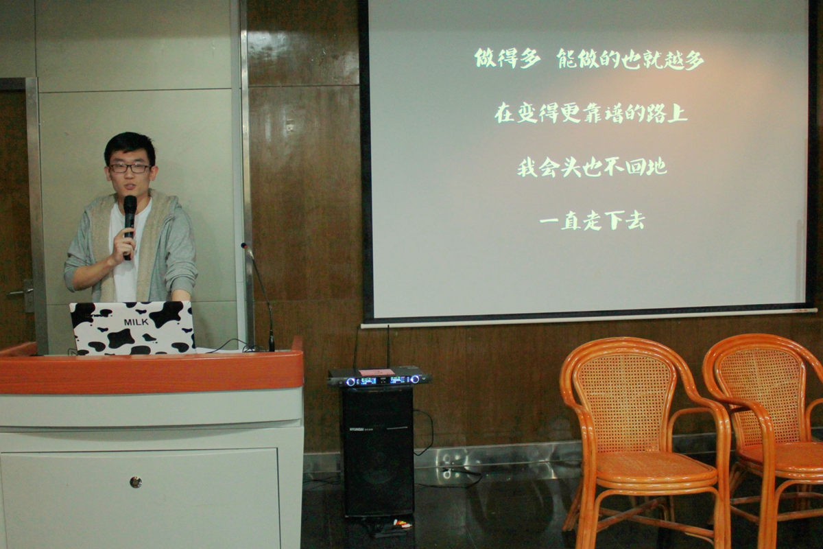 接下来校学生会副主席刘玉博同学围绕“竞”分享了他的学生工作经历,他认为自己是一个幸运的人,学生工作竟有了今天这样的成就。大一时他幸运地成为了班长;后来又参加了校会组织部。刘玉博同学在学生工作上的成就不仅仅是幸运使然,更是他埋头苦干的结果。他勇于承担,大二担任了辅导员助理,他不愿放弃,成功竞选了校会组织部部长。做得多,能做的也就越多,在变的更靠谱的路上,他会头也不回地一直走下去。