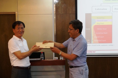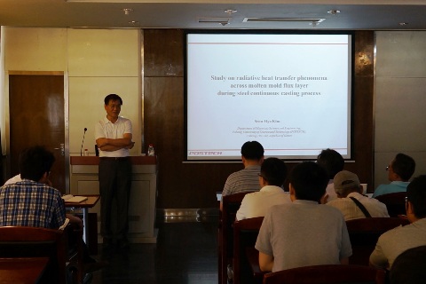 各学术报告为时一个半小时,报告围绕连铸保护渣的传热行为展开,分别探讨了不同添加组元对保护渣辐射传热的影响,如Li2O、B2O3。Kim教授向师生们展示了他在保护渣研究方面与浦项钢铁公司合作的最新成果。各位教授及研究生们对Kim教的讲座给予热烈的掌声。
