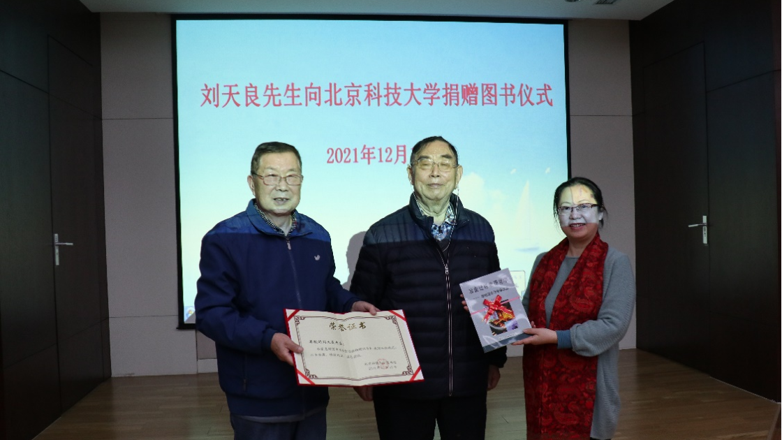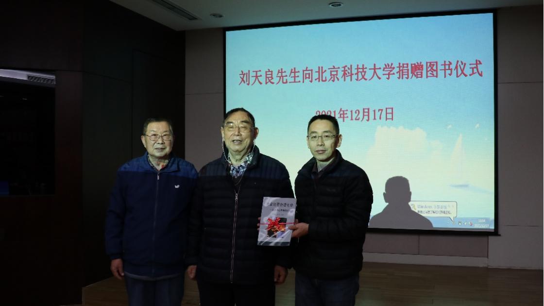在葛昌纯院士的见证下,刘天良教授为冶金工程学科和校图书馆捐赠了图书,闫柏军教授和张利主任作为代表接受了所捐图书,校图书馆为表示对刘天良教授的诚挚谢意,特为其颁发了荣誉证书。