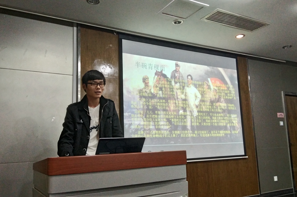 梁俊威同学向同学们分享了几则红军长征中的真实故事,幽默的讲解更是引起了同学们的兴趣。他讲解了“半碗青稞面”、“丰碑”、“一袋干粮”这三个小故事,引来同学们的深思,更了解了红军长征两万里的艰难困苦。最后他语气沉重的说出“红军长征胜利八十周年,地址都成了遗址,笑容都成了遗容;长征是他们的苦难,苦难是他们的光荣。”