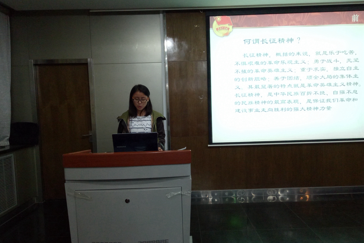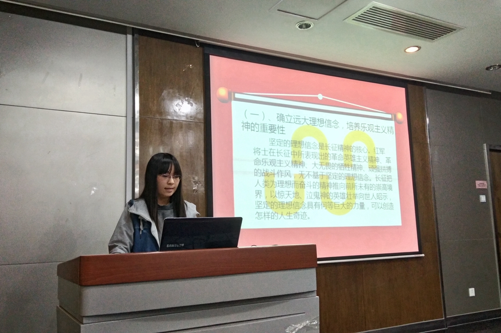 赵秀云同学围绕“学长征精神,做红色传人”进行了声情并茂的演讲,她指出在经济全球化和世界多极化的背景下,在建立社会主义市场经济的新形势下,学习长征精神,对提高当代大学生的思想政治觉悟,培养中国特色社会主义的合格建设者和接班人,具有重要意义。并提出学习长征精神需要确立远大理想信念培养乐观主义精神,培养艰苦奋斗精神,培养万众一心团结拼搏的集体主义精神。