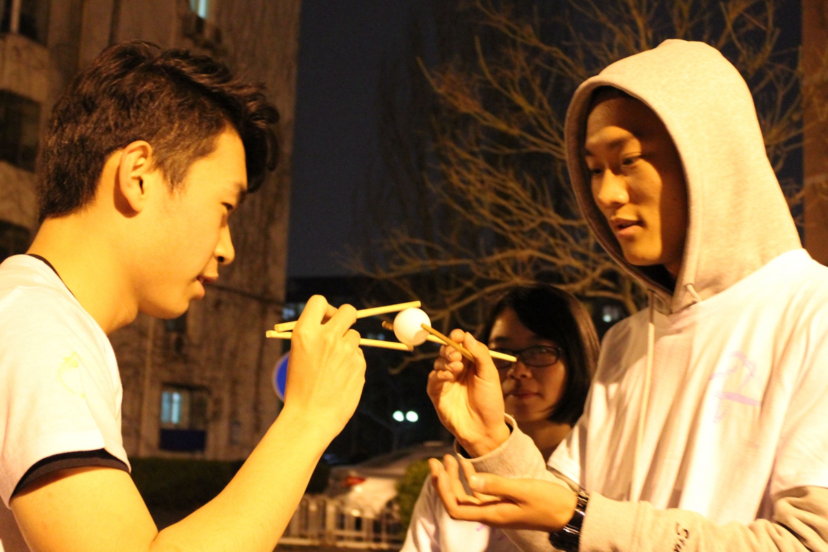 1号站点设置在五环广场,学生会主席邓雨平和吃瓜网站主任赵子晗同学担任裁判。参赛选手需要找本队人数的二分之一位路人分组踢毽子,每组至少两名队员,一位路人,连续完成十个即可过关。这项游戏考察了参赛人员身体协调能力和组员默契程度,有利于团学内部建设。2号站点在八九斋东侧花园,裁判是王甜雨和吕彬玉同学。参赛者在回答了“西门的毛主席像伸的是哪只手”这个问题后才可进入游戏环节。游戏是参赛者相互传递乒乓球并且保持球不掉落,有些成员夹着的乒乓球自由落体而有些成员则夹着乒乓球健步如飞。