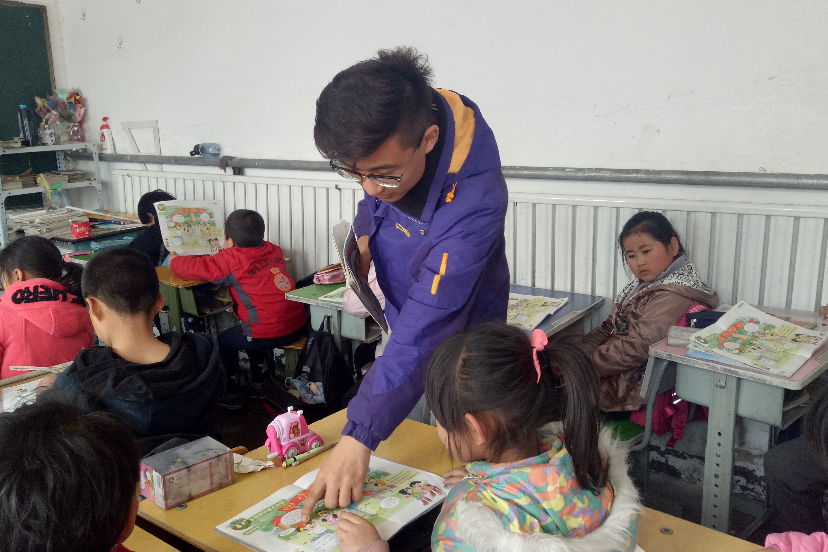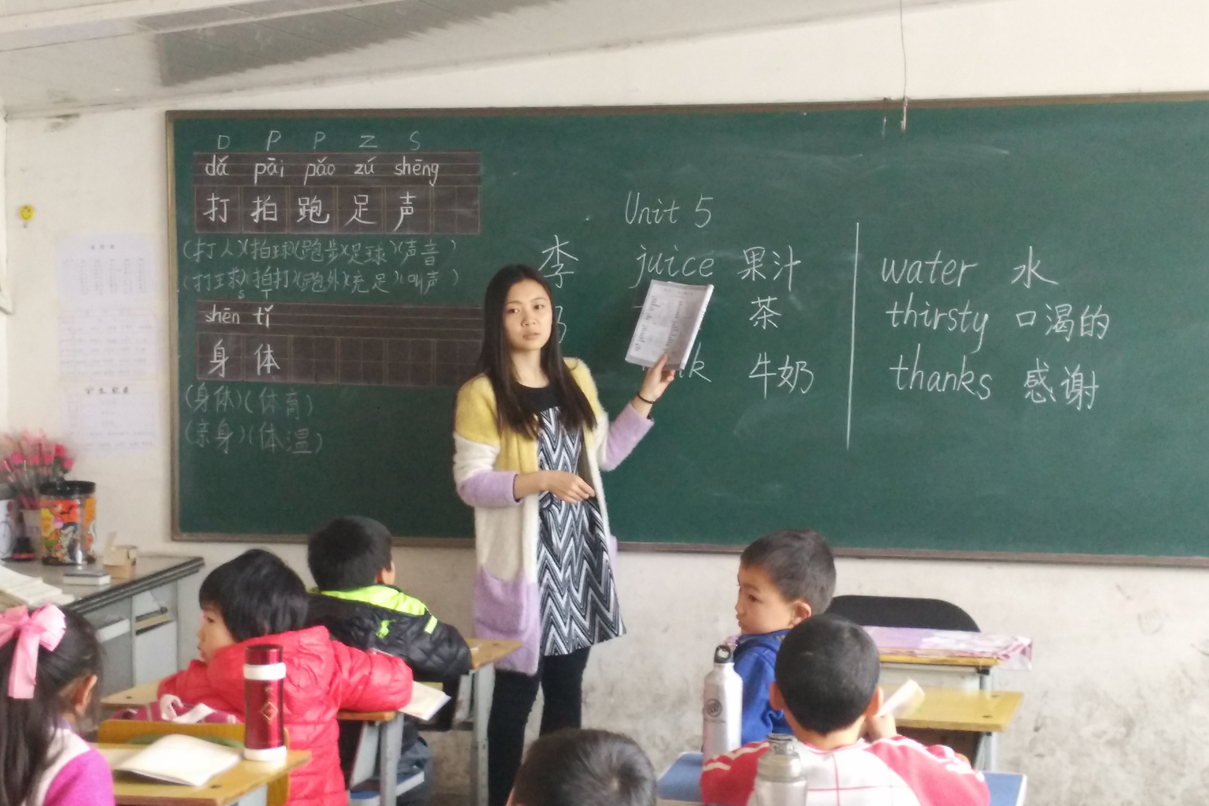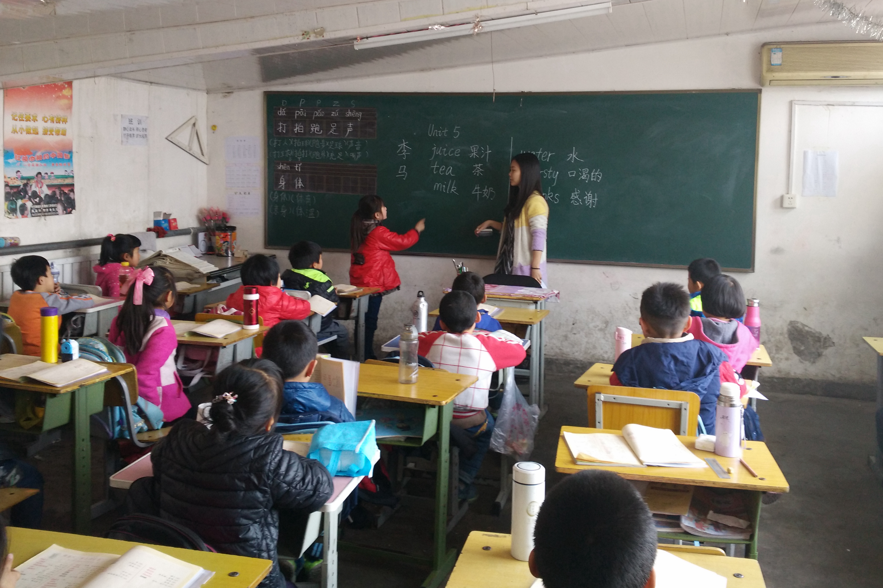 王春阳和李梦娟同学负责为一年级的两个班级讲授英语课程。本次授课主要是教学生们认识单词,由于孩子们正在读一年级,没有学习过二十六字母和音标,所以志愿者们的任务就是教会孩子们熟读第五单元的单词。志愿者们耐心教读,学生们认真听讲,当遇到不会读的单词时,他们会勇敢地提出,志愿者们一遍一遍地重复教他们识记,直到整个班级的学生们都会读为止。