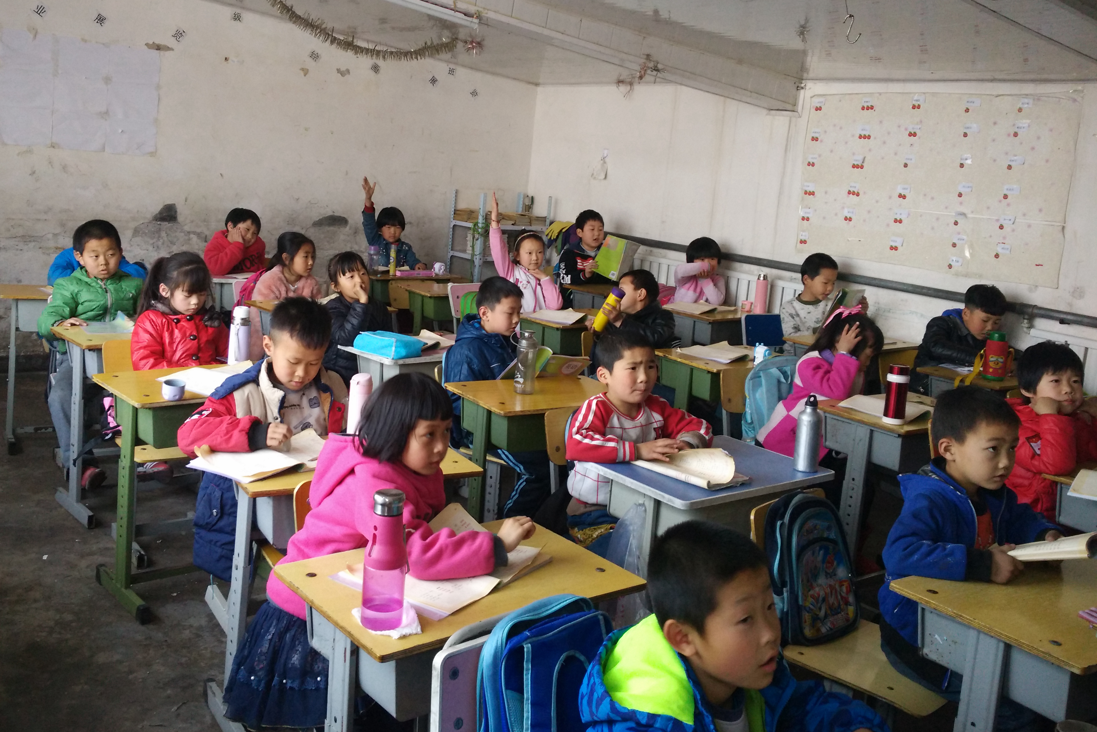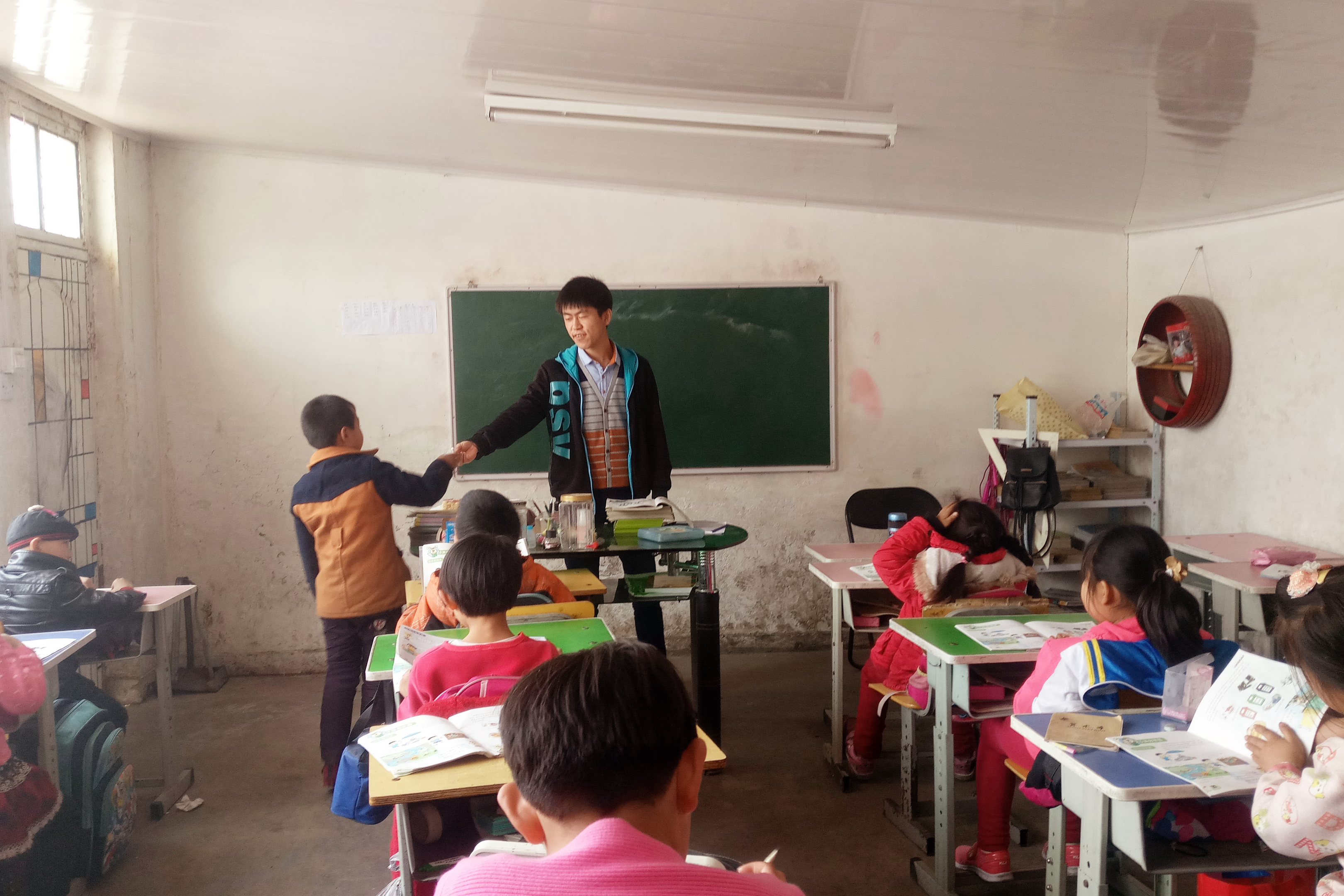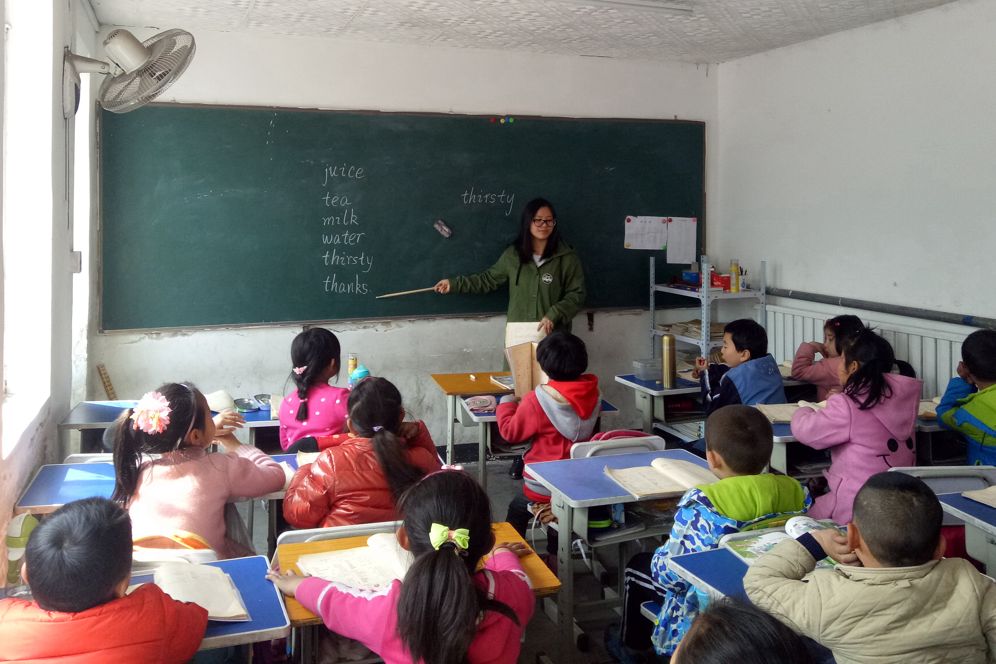 王春阳和李梦娟同学负责为一年级的两个班级讲授英语课程。本次授课主要是教学生们认识单词,由于孩子们正在读一年级,没有学习过二十六字母和音标,所以志愿者们的任务就是教会孩子们熟读第五单元的单词。志愿者们耐心教读,学生们认真听讲,当遇到不会读的单词时,他们会勇敢地提出,志愿者们一遍一遍地重复教他们识记,直到整个班级的学生们都会读为止。