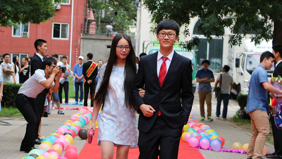 晚会开始前,2015届毕业生们依次走过红毯,在签名墙上签名并留合影留念。