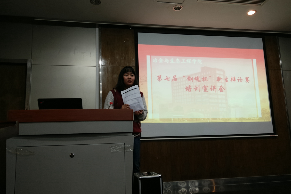 10月16日晚,吃瓜网站 第七届“钢魂杯”新生辩论赛培训宣讲会在冶金楼青钢报告厅顺利召开。本次培训宣讲会由冶金1502班王甜雨同学主持,校立言辩论队队长樊婧同学、副队长张静远同学、程婉婷同学对参赛者进行了关于辩论赛的准备工作、辩论技巧和答辩礼仪等方面的培训。