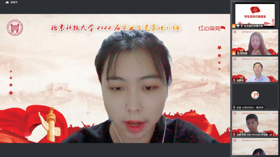 毕业生党员代表纷纷回忆在北科度过的美好时光,表达了对母校及党组织教育、培养的感激之情。钢铁冶金新技术国家重点实验室硕2019级赵新宇在分享中表示,毕业生党员同志们要牢记“求实鼎新”校训,怀火热之内心,含真诚之目光,不负母校的培养,争做社会栋梁。冶本18党支部叶新玥回忆本科四年点滴,许下要努力在科研领域、行业一线绽放冶金人无限光芒,成为新时代国家建设者的庄严承诺。交流环节中,针对毕业生们提出的研究生阶段学习、初入职场等问题,与会教师们进行了详细解答。